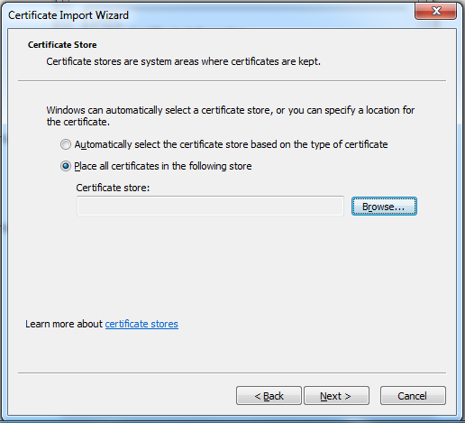 5. Choose the option “Place all certificates in the following store” and select browse.