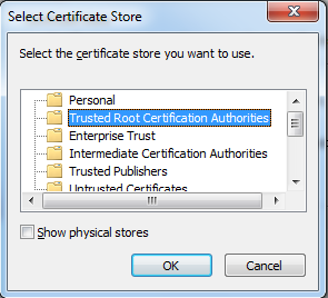 7. If “Local Computer” is not found as an option, uncheck “show physical stores”, and select “Trusted Root Certification Authorities” and Click OK.